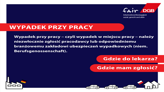 🚑 Wypadek przy pracy – czyli wypadek w miejscu pracy – należy niezwłocznie zgłosić pracodawcy lub odpowiedniemu branżowemu zakładowi ubezpieczeń wypadkowych (Berufsgenossenschaft).